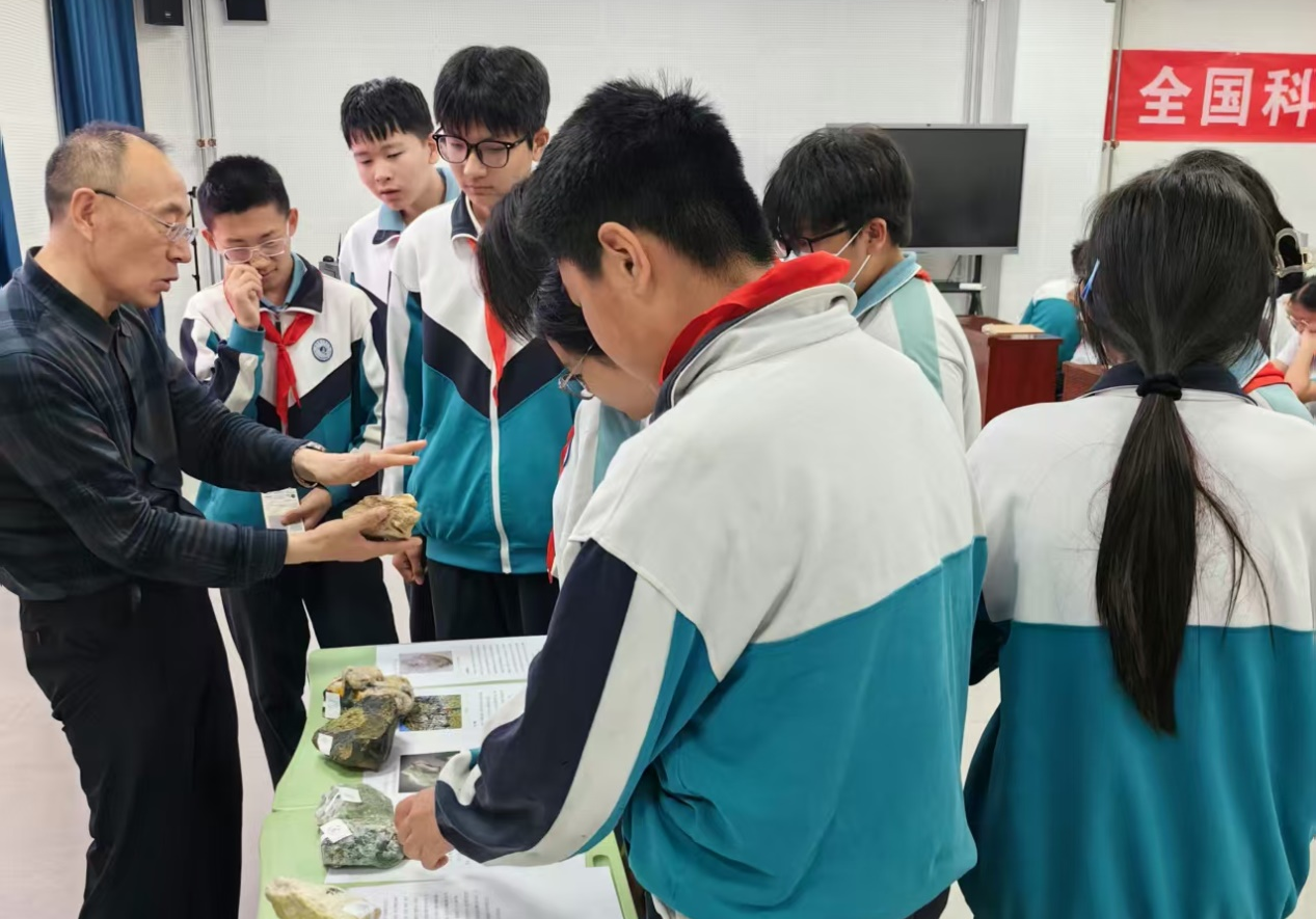 在华侨城实验学校,刘蕴高级工程师以《认识黄河,保护母亲河》为题,宣传了黄河流域生态保护和高质量发展的重要意义,展现了水环中心在黄河流域水文地质与水资源调查监测方面取得新进展新成果,并将野外地质调查实践和初中生地理课本知识深度融合,通过讲解、视频和互动问答,给现场学生们展示了一场融合“光、声、影”的教学实践课,让课本上的地学知识变得通俗易懂。同时,科普专家宣讲团现场展示了丰富的矿石、化石、岩石等地质标本,让学生们近距离观察不同的岩石标本,详细讲解其形成过程及地质意义。学生们通过亲手触摸标本,沉浸式感受大自然的鬼斧神工,进一步激发对地球科学的浓厚兴趣。